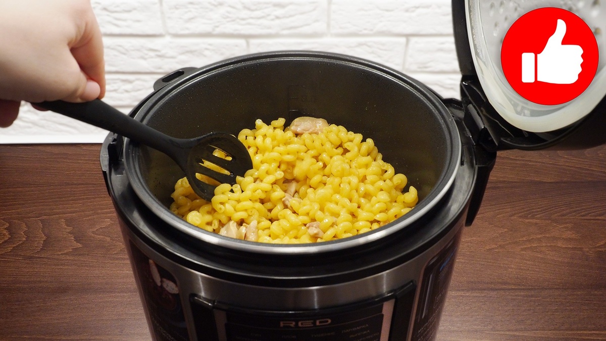 Разогрейте масло в мультиварке и поджарьте курицу небольшими кусочками примерно 5 минут, пока она почти не приобретет золотистый оттенок. Затем добавьте куркуму, соль и сухие макароны. Разровняйте смесь, залейте горячей водой и выберите режим готовки. На обычном мультиповаре это около десяти минут, если включена функция выпечки или стандартный режим приготовления.
