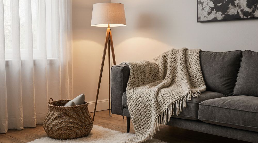 Большой текстильный плед: он должен постоянно находиться на диване, приглашая к уютным вечерним посиделкам. Выбирайте мягкие и приятные на ощупь ткани, такие как вельвет или натуральная шерсть.Компактный журнальный столик: с местом для хранения, чтобы ваши любимые аксессуары всегда были под рукой, но не создавали визуального шума.Светильник с теплым светом: забавный торшер или настольная лампа создают мягкое освещение, которое делает атмосферу более уютной.Красивая корзина для мелочей: идеально подойдет для хранения игрушек или журналов, что позволит быстро навести порядок.Живое растение: озеленение комнаты, например, в виде замиокулькаса, добавляет свежести и тепла в интерьер.Спальня: укрытие для отдыха