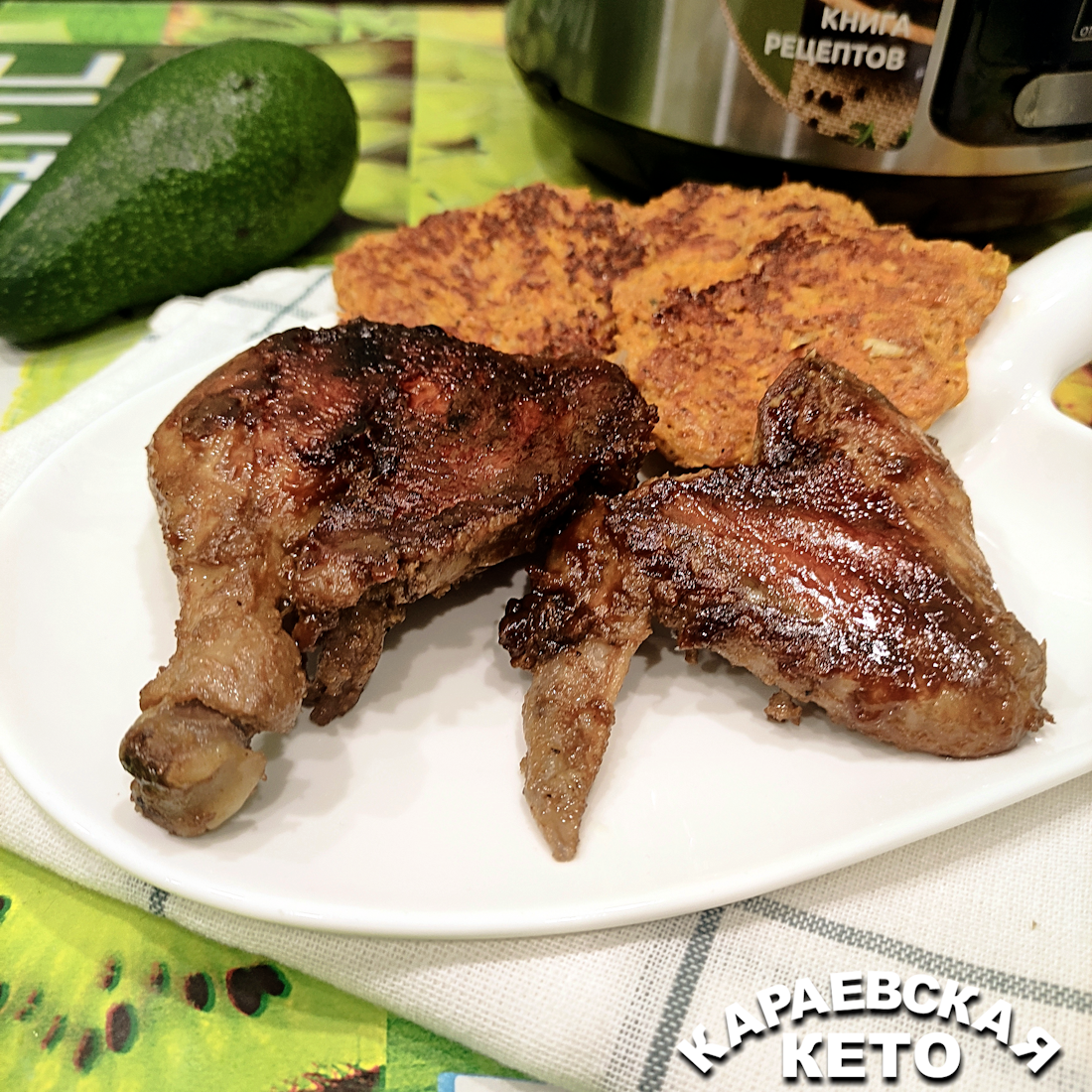 Курицу можно подавать с гарниром, например, с оладьями из тыквы — это будет идеальное сочетание!