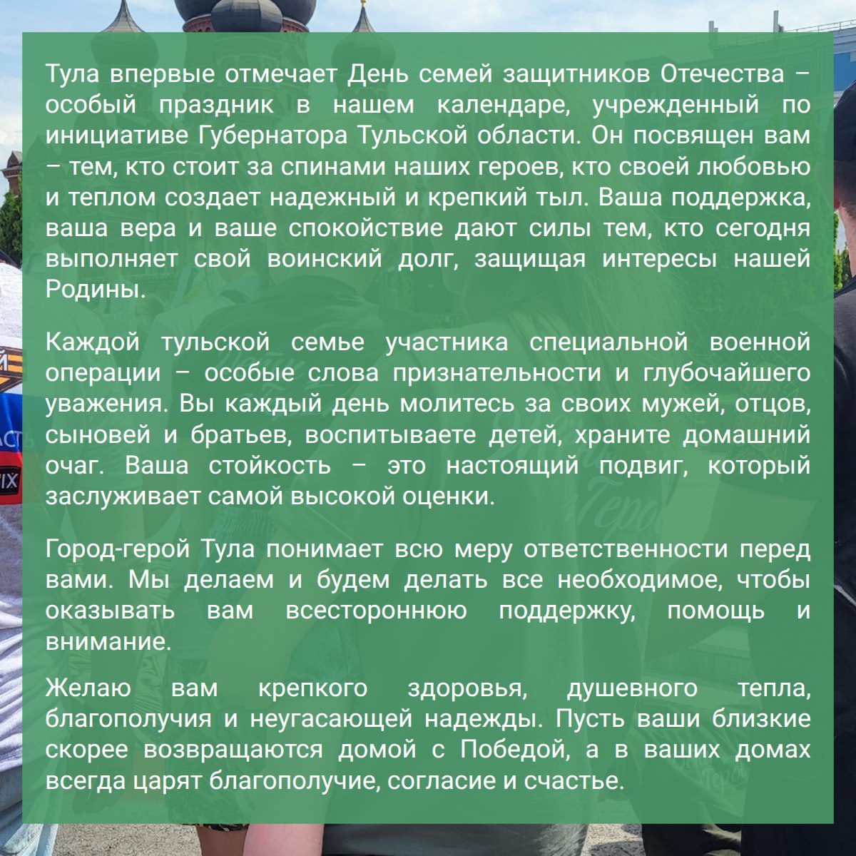 Тула и регион впервые отмечают День семей защитников Отечества – особый праздник в нашем календаре, учрежденный по инициативе семей военнослужащих и Губернатора Тульской области Дмитрия Миляева. Он посвящен вам – тем, кто стоит...