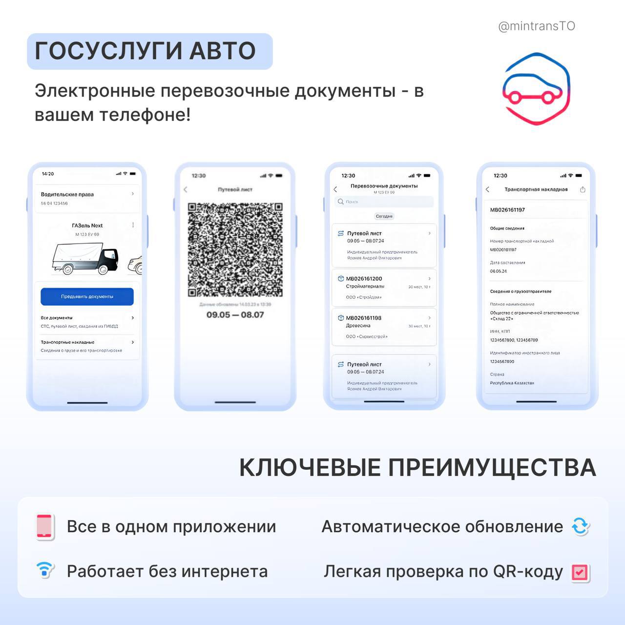 С 1 сентября все необходимые документы для перевозки будут доступны в мобильном приложении «Госуслуги Авто». Путевой лист и транспортная накладная загружаются автоматически и всегда под рукой в виде QR-кода.