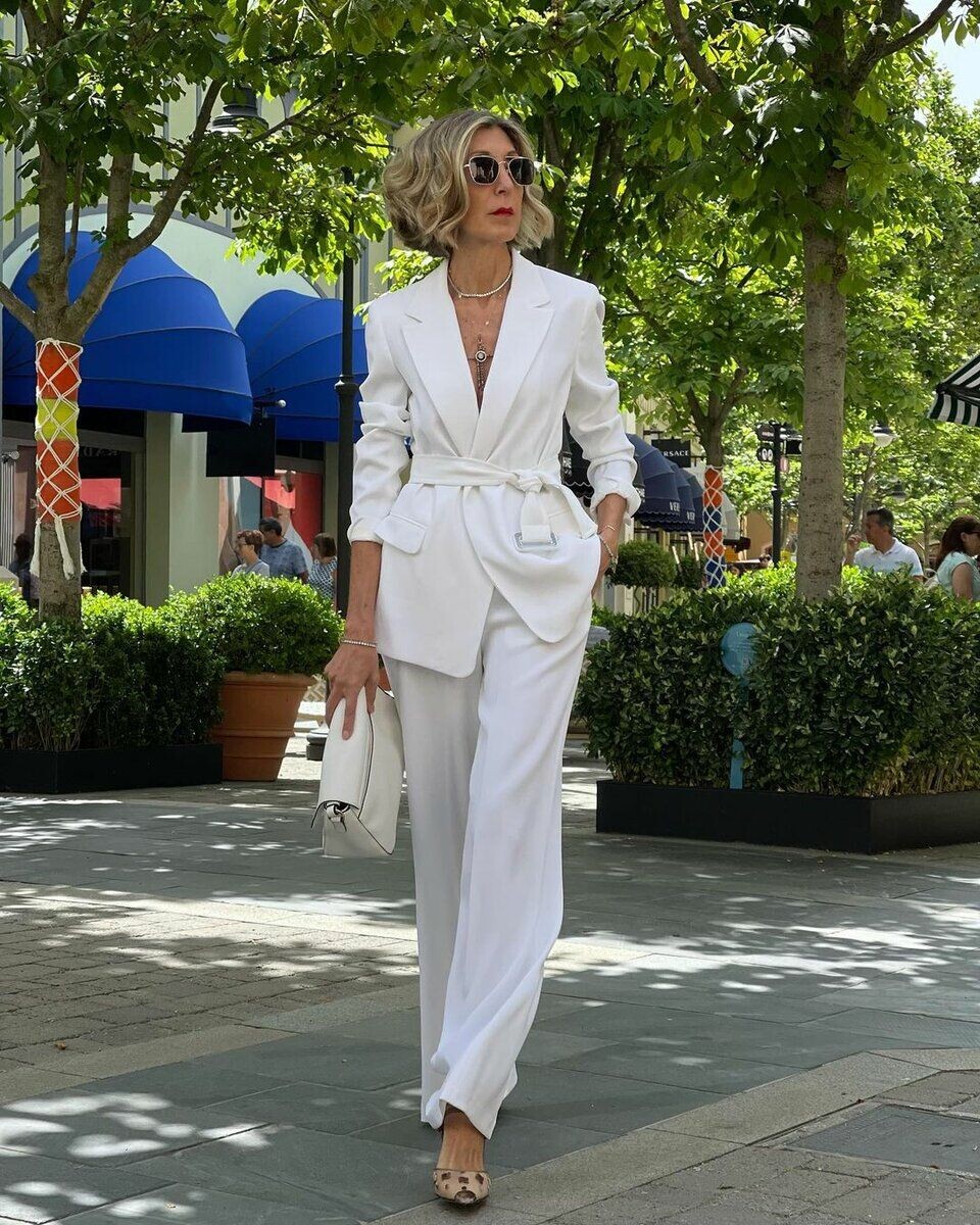 - Сияем в белом: Белый цвет отлично подчеркивает индивидуальность и свежесть. Образ в стиле «тотал уайт» состоит из свободных брюк и удлиненного жакета с поясом, что создает эффект стройности. Такой лук уместен как на деловой встрече, так и на торжественном мероприятии.