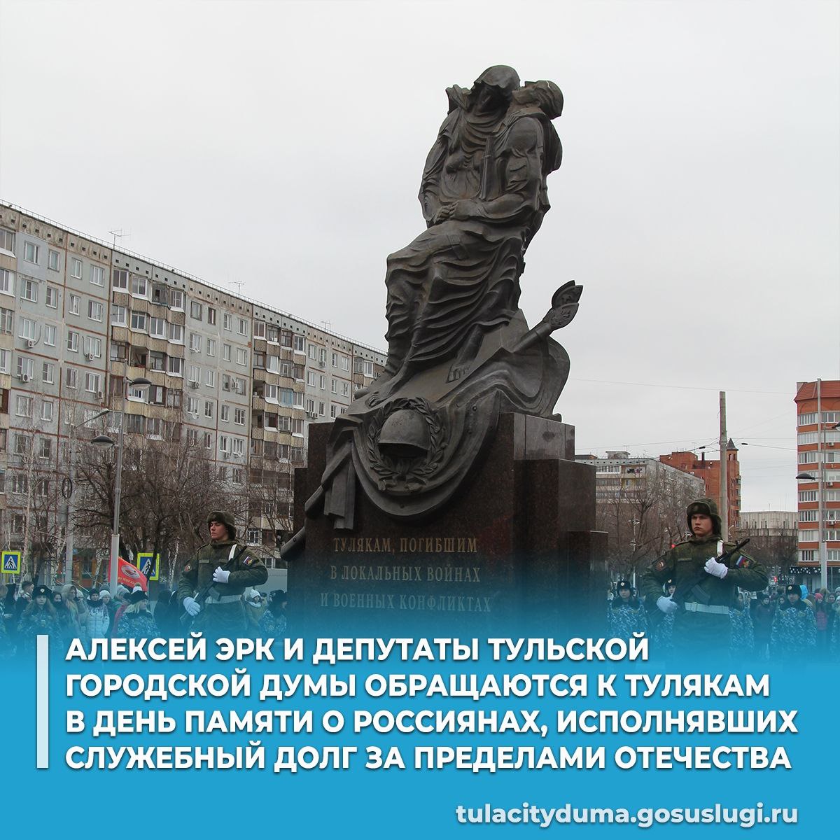 Глава города Тулы Алексей Эрк и депутаты Тульской городской Думы обращаются к тулякам в День памяти о россиянах, исполнявших служебный долг за пределами Отечества.
