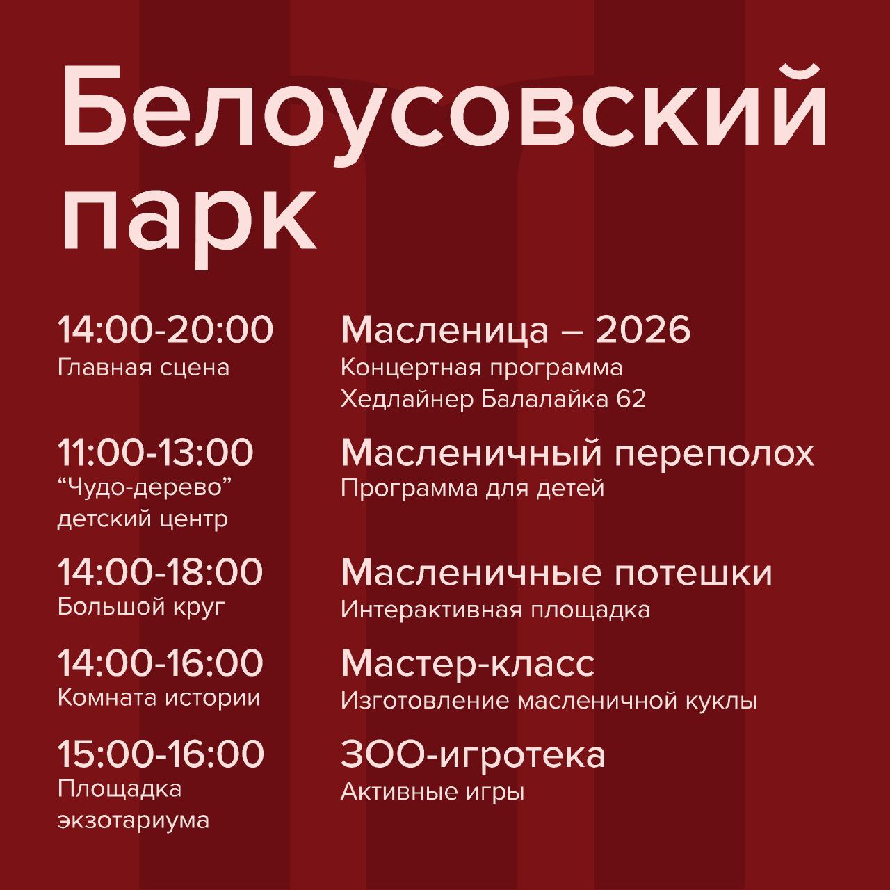 С 14:00 до 18:00 — концертная программа «Широкая масленица», анимационные игры для детей и интерактивные площадки для всей семьи.