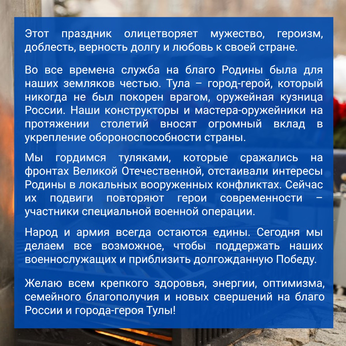 Этот праздник олицетворяет мужество, героизм, доблесть, верность долгу и любовь к своей стране.Во все времена служба на благо Родины была для наших земляков честью. Тула – город-герой, который никогда не был покорен врагом, оружейная кузница России....