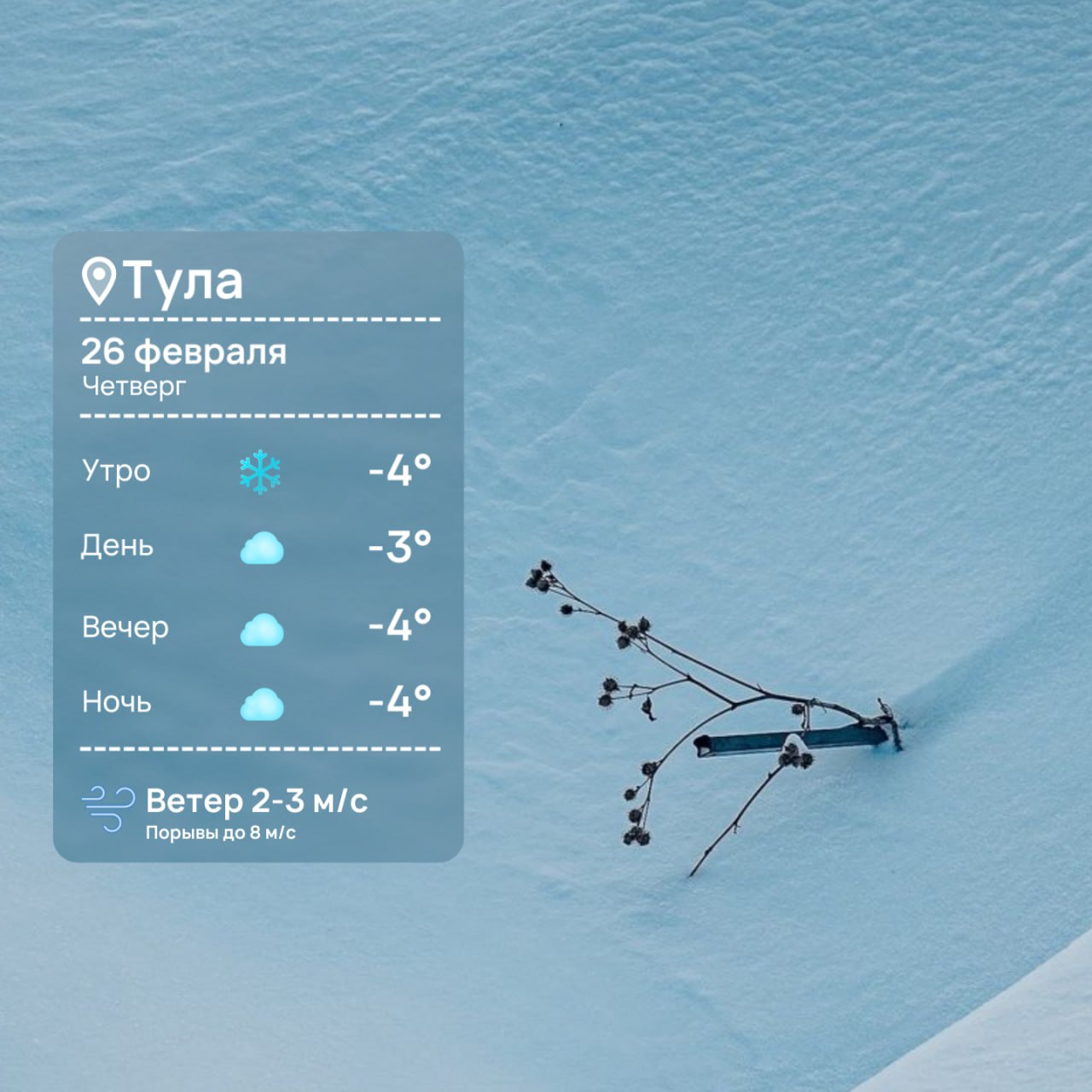 Погода на 26 февраляВремя рассвета: 07:26.Время заката: 17:58.Световой день: 10 ч. 32 мин.Температура воздуха: -3°C (днем), -4°C (ночью).Пасмурно, осадков не ожидается.Геомагнитная обстановка: спокойная.ТСН24 | Прислать Новость | Мы в МАХ