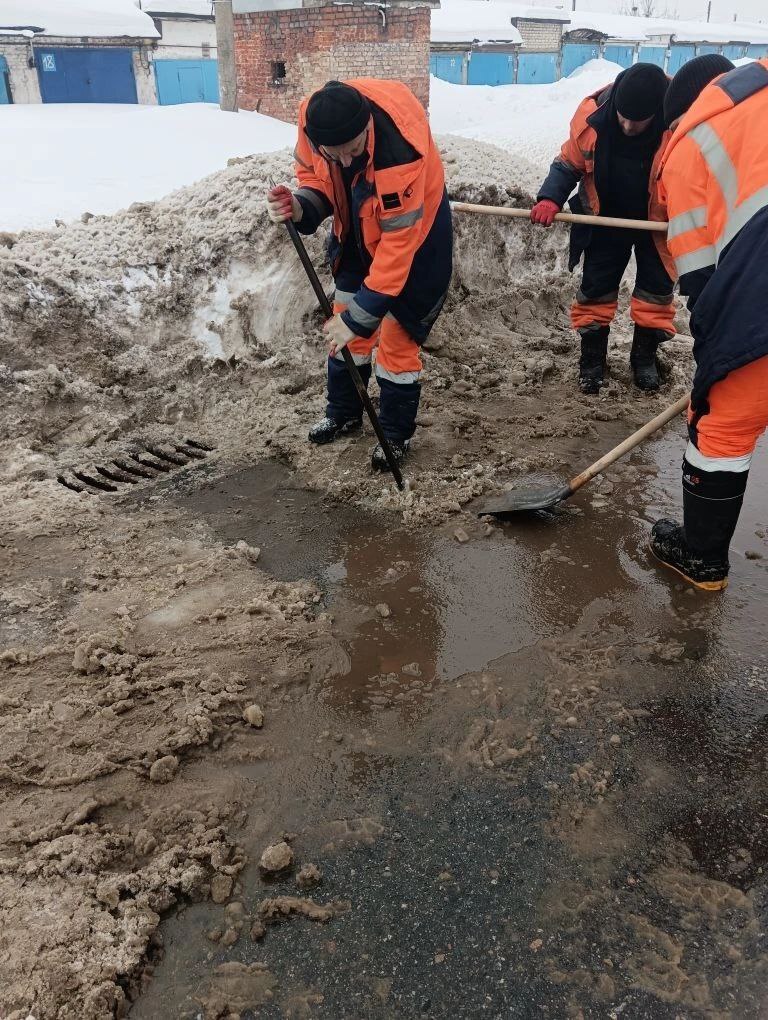 Спецтехника откачивает воду с проезжих частей, тротуаров, на мостовых сооружениях. Параллельно с ней рабочие очищают дождеприемные решетки от талого снега, мусора и наледи. Прочищают водоотводные лотки.