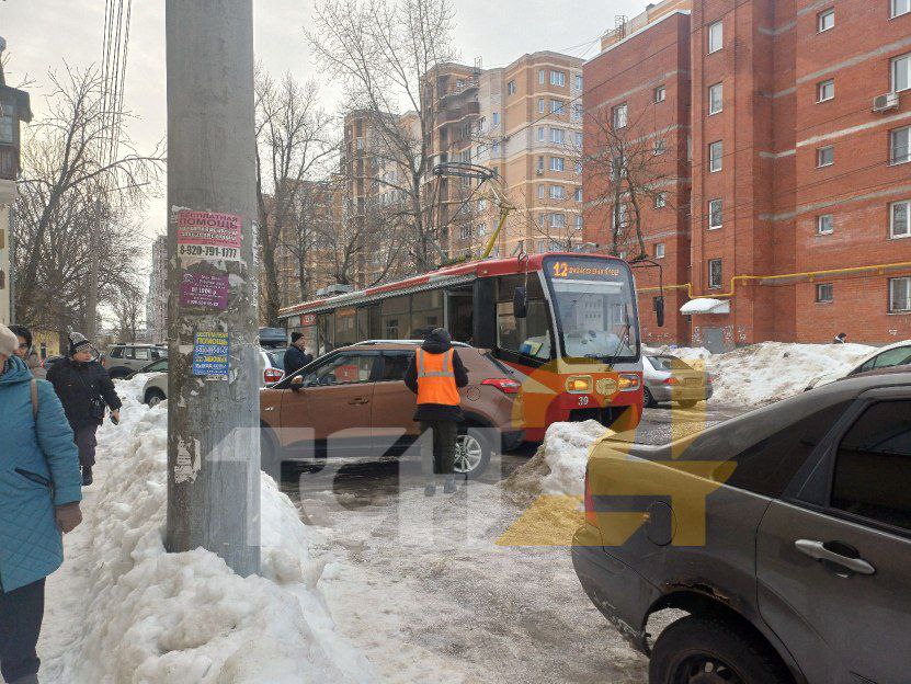 Трамваи встали на улице Михеева из-за припаркованной машины, которая частично перекрывает путь