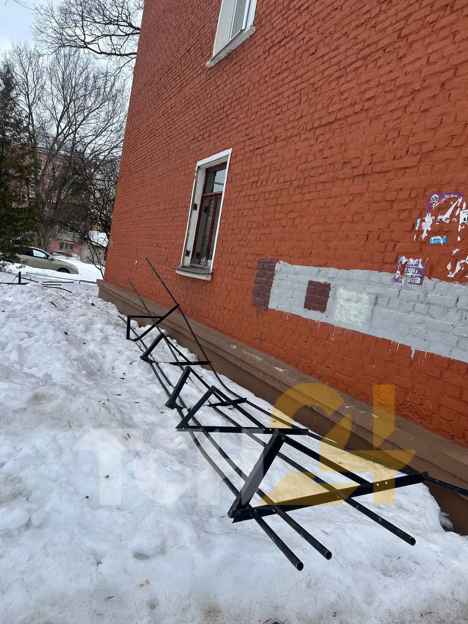 Металлические конструкции лежат на тротуаре рядом с домом. Жители опасаются, что их могли не снять, а сорвало из-за осадков.