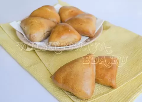 Каждый кусочек теста нужно превратить в лепешку, в центр которой добавить по столовой ложке картофельной начинки. Затем защипите тесто, придавая форму пирамиды, и уложите на смазанный растительным маслом противень швом вниз. Смажьте пирожки взбитым яйцом и выпекайте в предварительно разогретой до 190 градусов духовке около 25 минут. И вот они – золотистые, румяные и ароматные пирожки готовы порадовать вас и ваших близких!