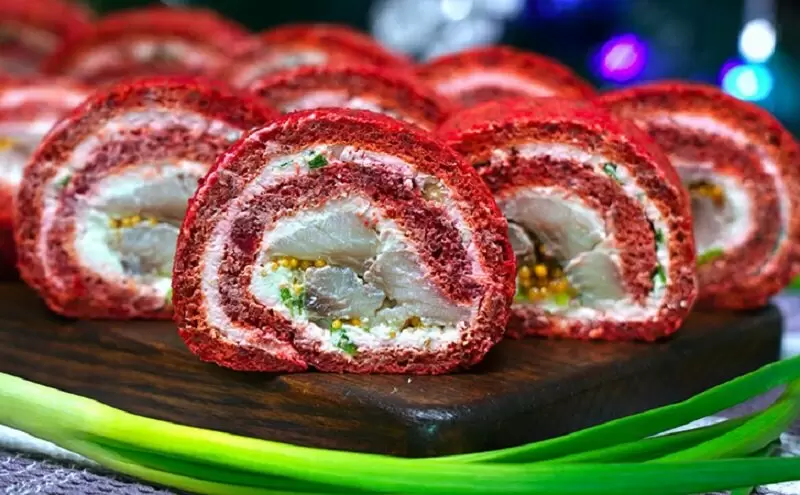 Перед подачей к столу аккуратно разворачиваем рулет, нарезаем на ломтики и выкладываем на сервировочное блюдо, дополнительно украсив зеленью. Ваши гости не только оценят новый взгляд на привычный салат, но и обязательно попросят добавку!