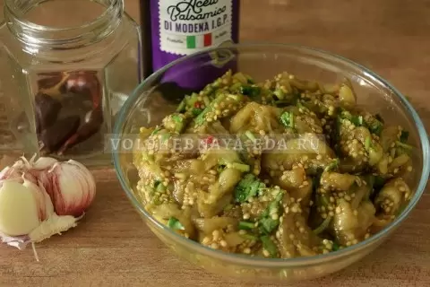 Далее, аккуратно снимите корочку с баклажанов — она отделяется без труда — и нарвите мякоть на небольшие кусочки. Всё это потребуется поместить в миску, добавить подготовленное масло, уксус, мелко нарезанную кинзу, измельчённый чеснок, а также посолить и поперчить по вкусу.