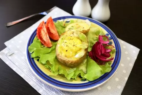 В середину каждой картошки аккуратно разбивается яйцо. Духовку стоит предварительно разогреть до 200°C. Форму для запекания стоит застелить фольгой для удобства, после чего в ней размещается картофель. Запекается все это в духовке около 10-15 минут, пока желток не начнёт застывать.