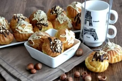 Начинять профитроли можно несколькими способами. В данном рецепте применяется способ с небольшим надрезом. Остывшие профитроли наполнить кремом, а затем украсить: половину покрыть белым шоколадом с миндальными лепестками, другую половину — темным шоколадом с дробленым фундуком. Эти сладости точно не оставят никого равнодушным на любом мероприятии!