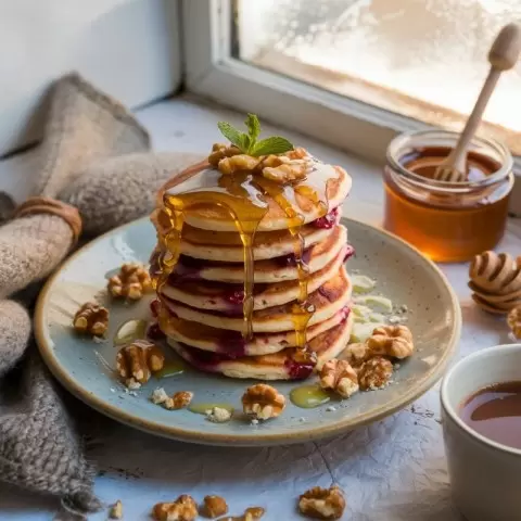 - Оладьи с клюквой — идеальный завтрак, который радует не только вкусом, но и внешним видом.