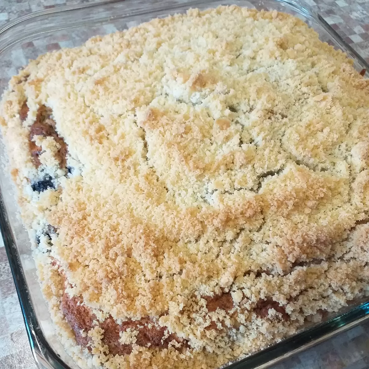 Вылейте тесто в подготовленную форму, равномерно распределите его, и посыпьте сверху штрейзелем. Выпекайте в разогретой духовке примерно 40-45 минут, пока кекс не станет золотистым. Проверьте готовность, проткнув его деревянной палочкой — она должна выходить сухой.