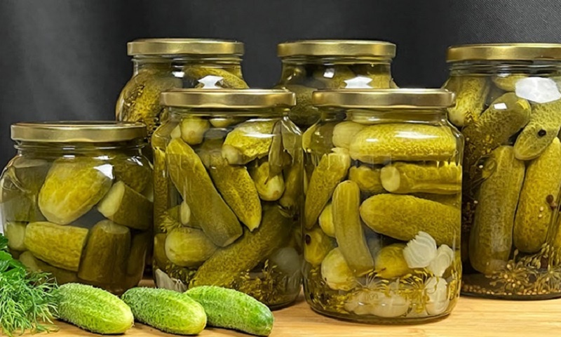 - Приготовление: Огурцы замачивают, укладывают в банки с пряностями, заливают горячим маринадом и стерилизуют перед закаткой.