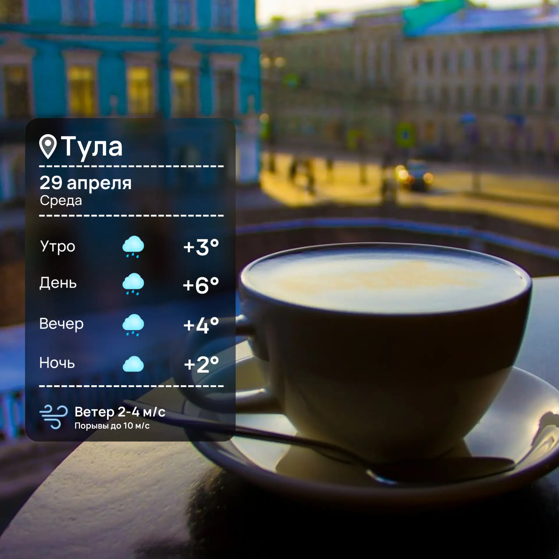 Доброе утро В Туле сегодня пасмурно, пройдет небольшой дождь. Что касается температуры, то ожидается лишь +5 градусов.Пусть среда пройдет легко и позитивно! А там уже скоро и майские. Верьте в себя и свои силы.