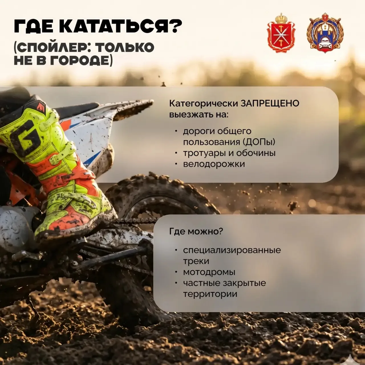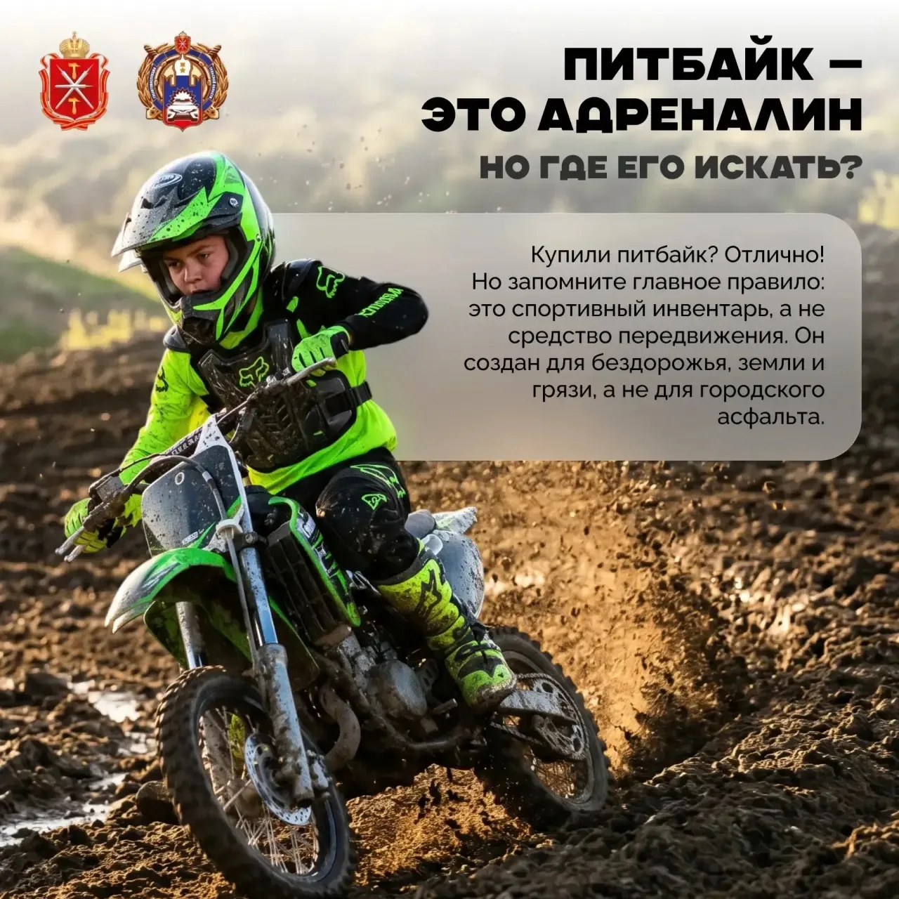 Напоминаем: питбайк — это спортивный инвентарь. Передвигаться на нем по дорогам общего пользования, тротуарам и обочинам ЗАПРЕЩЕНО.